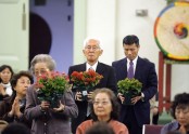 8일 관음사 창립 35주년 기념법회가 100여 명의 불자들이 모인 가운데 개최됐다. 참석자들이 대련스님의 설법후 부처님에게 헌화하고 있다. 오른쪽부터 이교흠 관음사 CEO, 김목응 관음사 이사장. <신현식 기자