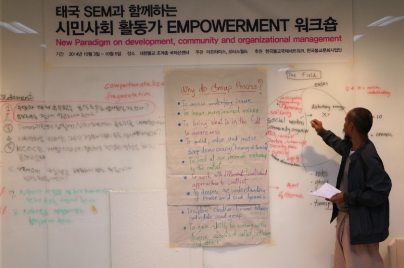 국제개발협력단체 더프라미스(이사장 법등스님)와 로터스월드(이사장 성관스님)는 태국 SEM(Spirit in Education Movement)의 훈련가를 초청하여 지난 10월 3일부터 3일간 목동 국제선센터에서 ‘태국SEM과 함께하는 시민사회활동가 역량 강화 워크숍’을 진행했다.