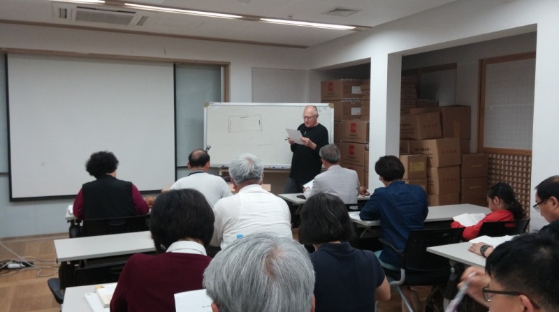 5월 21일, 저녁 7시에 시작한 강의가 두 시간 넘게 진행되고 있는 전법회관 지하 1층 교육관, 늦은 시간임에도 수강생들의 눈빛은 초롱초롱 빛난다. 영어를 통해 불교를 공부하는 색다른 수업이라 하나라도 놓칠까 집중하는 모습이다.