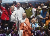 지구촌공생회의 자비행은 사막의 어린이들까지 즐겁게 하고 있다. 지난 4월30일 케냐 카지아도 지역 올로레라 태공초등학교 준공식 현장에서 환호하는 주민들과 이사장 월주스님 등 지구촌공생회 관계자들의 기념촬영.가는 곳